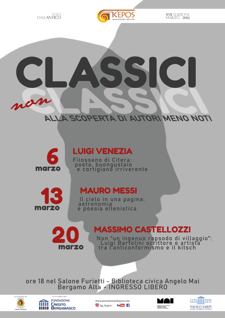 Anche quest’anno l’Associazione culturale K’epos propone l’iniziativa Voci dall’antico, un ciclo di letture di testi classici arricchito da commenti e approfondimenti. Giunta alla sua XVI edizione, l’iniziativa si pone l’obiettivo di rendere accessibili e coinvolgenti le fonti letterarie e iconografiche, grazie all’analisi di docenti di latino e greco, un docente di letteratura italiana e un fumettista.